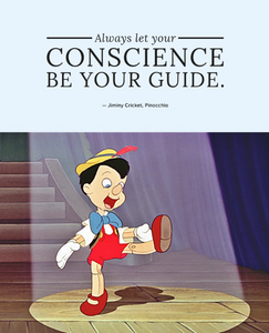 In the Disney film, Jimminy Cricket was Pinnochio’s conscience. The lovable little cricket started to dance while twirling his umbrella and sang; “Just let your conscience be your guide.” "When you get in trouble and you don't know right from wrong, Give a little whistle!"… "When you meet temptation and the urge is very strong, give a little whistle! Give a little whistle!"
